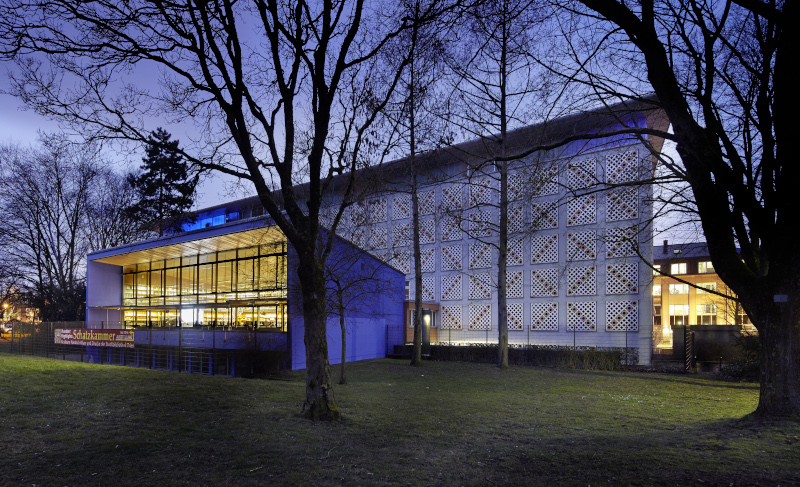 Außenansicht auf die Rückseite des Gebäudes von Wissenschaftlicher Bibliothek der Stadt Trier, Stadtarchiv und Schatzkammer am Abend